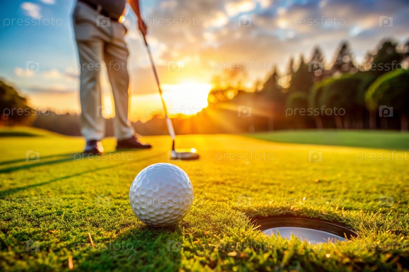 Баннер. белый мяч и металлическая клюшка для гольфа лежат на газоне в руках мужчины среди заката солнца. реклама матча по гольфу в кантри-клубе. свободное место для текста