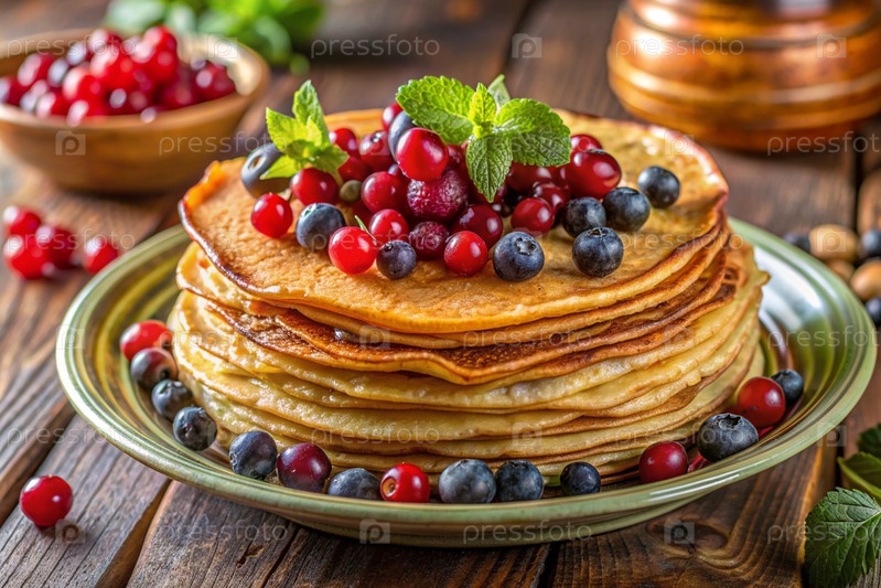 Вкусные блины с медом, ягодами, чернилами, клюквами и малиной.Концепция российского праздника Масленица