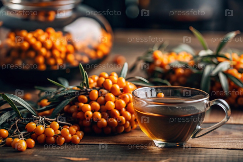 Здоровая, спелая ягода морского гречневого терна в ближайшем плане.Витамин, оранжевый, осенний, сезонный чай из ягод морского гречневого терна на темном фоне.Яблочный чай для иммунной системы