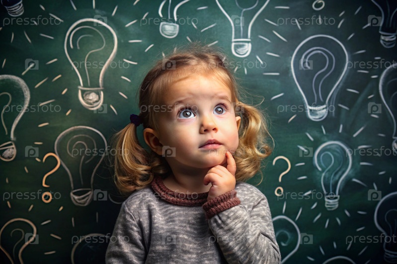 Развитие и образование детей. Вдумчивые девочки на темном фоне с лампочкой и вопросительными знаками. Брайнсторминг и концепция идеи