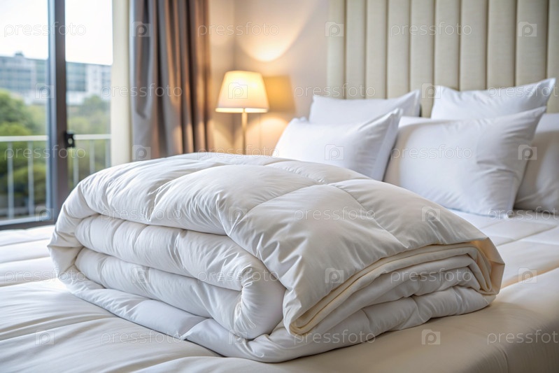 Подготовка к холодному зимнему сезону, уборка дома, гостиничный или домашний текстиль.Белое сложенное одеяло лежит на постели для макияжа