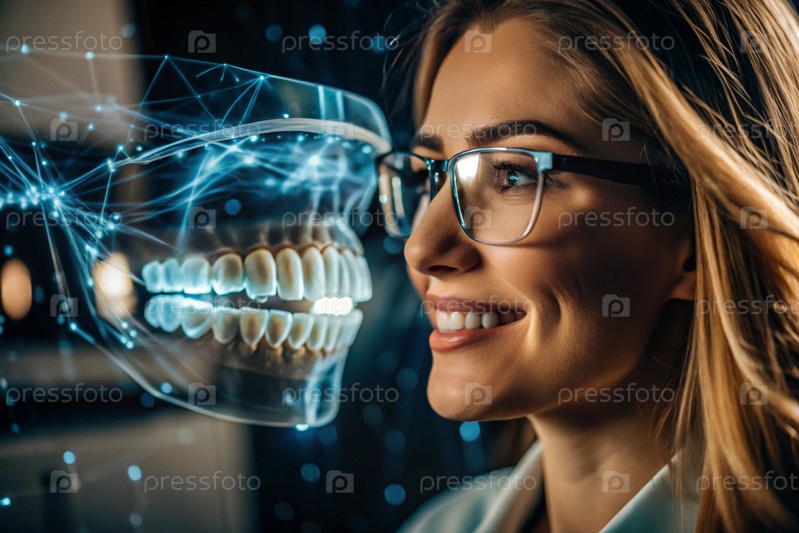 Новые технологии цифрового искусственного интеллекта в зубных протезах. Имплантаты. Женщина-стоматолог с идеальной улыбкой и цифровая графика на виртуальном экране. Концепция стоматологического здоровья и ухода за зубами