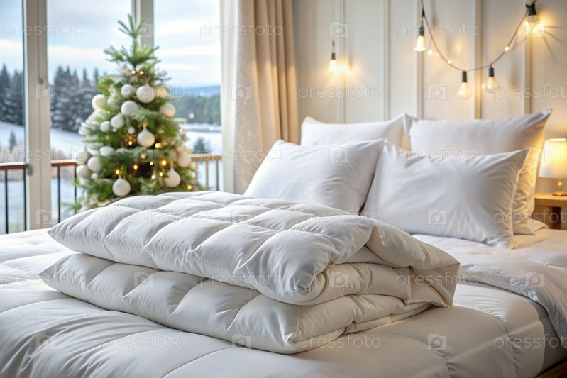 Подготовка к холодному зимнему сезону, уборка дома, гостиничный или домашний текстиль.Белое сложенное одеяло лежит на постели для макияжа