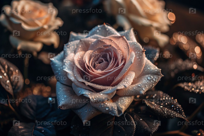 Кремовая роза красивого цвета кофе или шампанского, покрытая росой на рассвете. Красивое солнечное сияние. Фон изображения выполнен в зеленых и бежевых тонах. Естественный, экологически чистый естественный фон