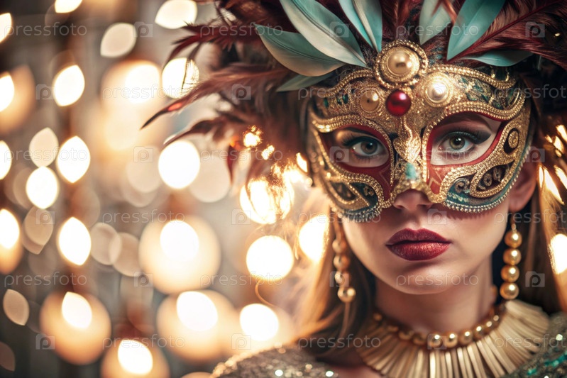 Карнавал Венеции.Закрытие женщины в украшенной карнавальной маске.Яркие цвета передают атмосферу празднования и роскоши