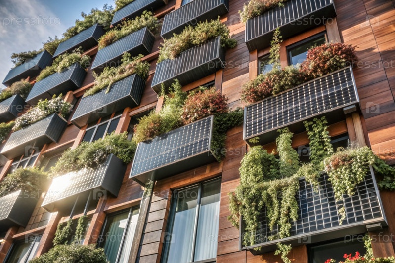 Новый жилой район с современными семейными новостройками, многоэтажное здание со солнечными батареями для электроснабжения и отопления фасадов