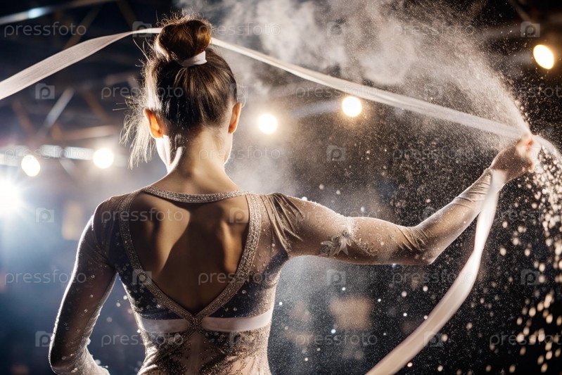 Ритмическая гимнастика - это крупный план красивой гимнастки с лентой в центре внимания на спортивной арене