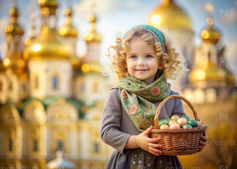 Счастливая Пасха. Христианство. Портрет трехлетней девочки в русском народном шале с плетеновой корзиной с пасхальными яйцами в руках на фоне православного храма