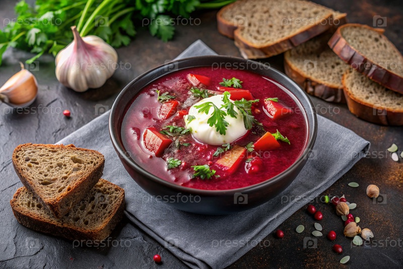 Традиционный украинский и российский борщ в стильной керамической тарелке с травами, сметаной и чесноком
