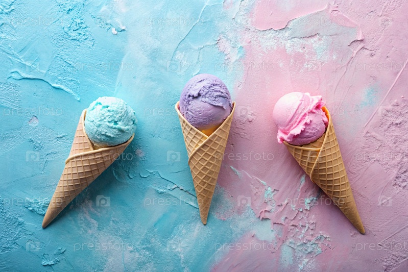 сладкий десерт. морозильные шишки разных вкусов. синий, розовый и фиолетовый мороженое на фоне трех пастельных цветов: синего, розового и фиолетового