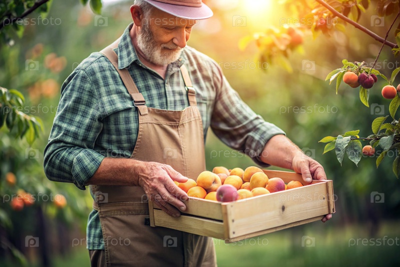 Сельскохозяйственная промышленность. Деревянный ящик с абрикосами в руках фермера-мужчины. Садовник собирает богатый урожай. Ближе, солнечный свет. Осенний урожай фруктов