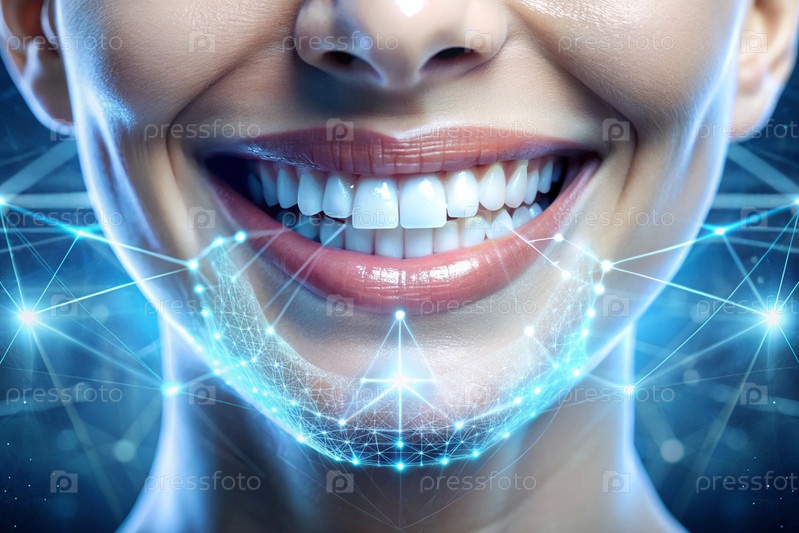 Новые технологии в протезировании зубов. Имплантаты. Улыбающаяся женщина со здоровой, идеальной улыбкой. Концепция стоматологического здоровья и ухода за зубами