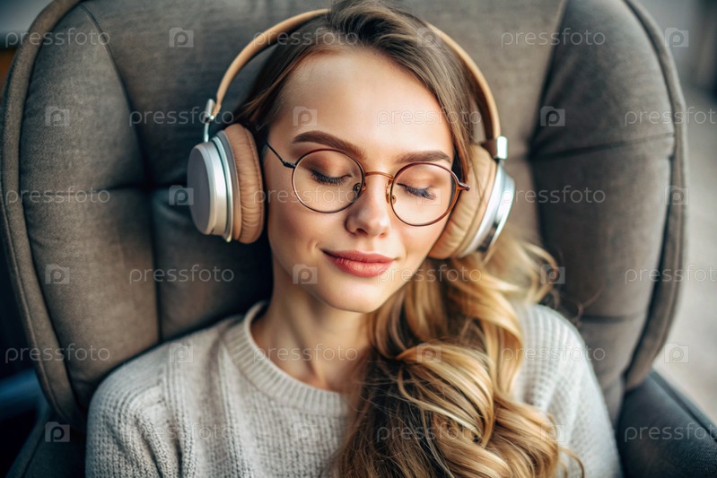Молодая красивая блондинка слушает музыку в больших беспроводных наушниках дома, на стуле в гостиной