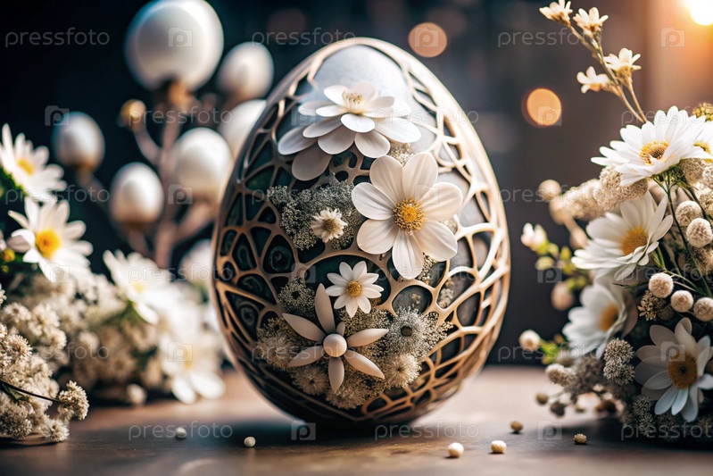 Пасхальный баннер. Концепция яркого пасхального праздника. Необычное деликатное пасхальное яйцо с нежными белыми цветами