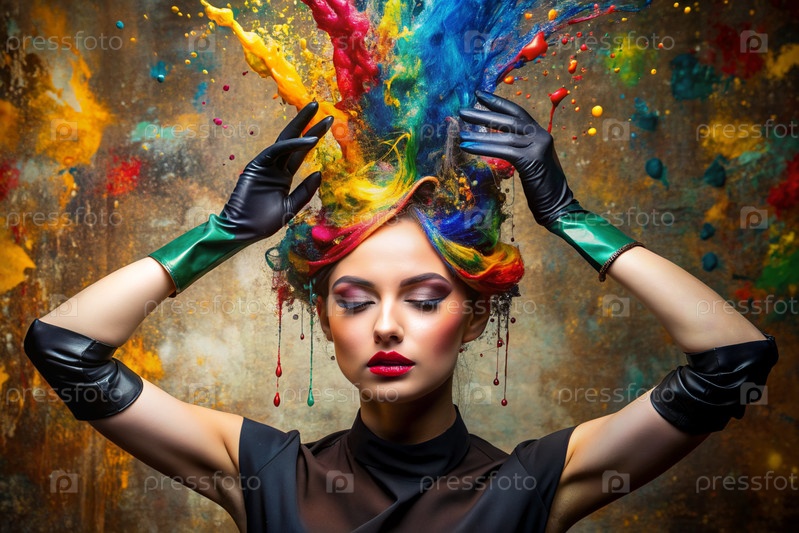 Творческий баннер для салона красоты или парикмахера. Модное профессиональное окрашивание волос. Красивая женщина с длинными многоцветными волосами. Взрыв цветов на голове