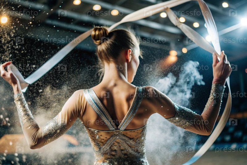Ритмическая гимнастика - это крупный план красивой гимнастки с лентой в центре внимания на спортивной арене