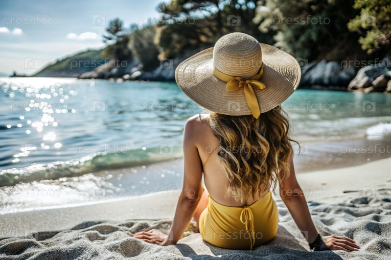 Женщина на отдыхе, сидящая в купальнике и соломенной шляпе с широкими краями на пляже в солнечный день и смотрящая на море