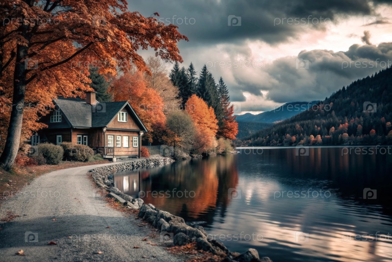 Осенний пейзаж. маленький уютный дом на берегу озера. деревья покрашены в яркие осенние цвета. атмосфера мира и гармонии с природой