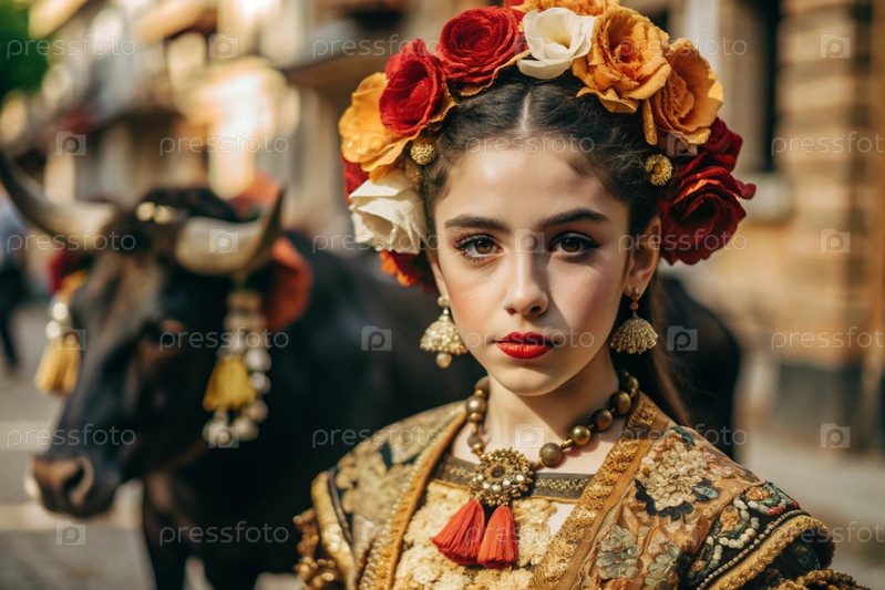Испанская девушка в традиционном испанском национальном костюме. Перед быком. Бикоборство. Портрет символизирует традиции и культуру народа Испании