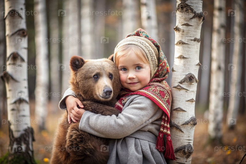 Красивая маленькая девочка в русской народной одежде и с платками на голове в березовой роще с живым медведем Русский фольклор, славянская мифология