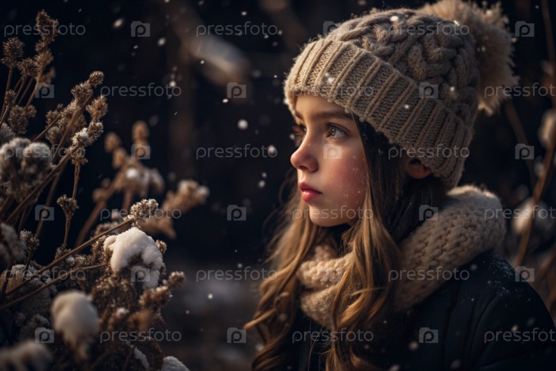 Зимний портрет. Близкий план молодой девушки в вязанной шляпе, шарфе и наружной куртке