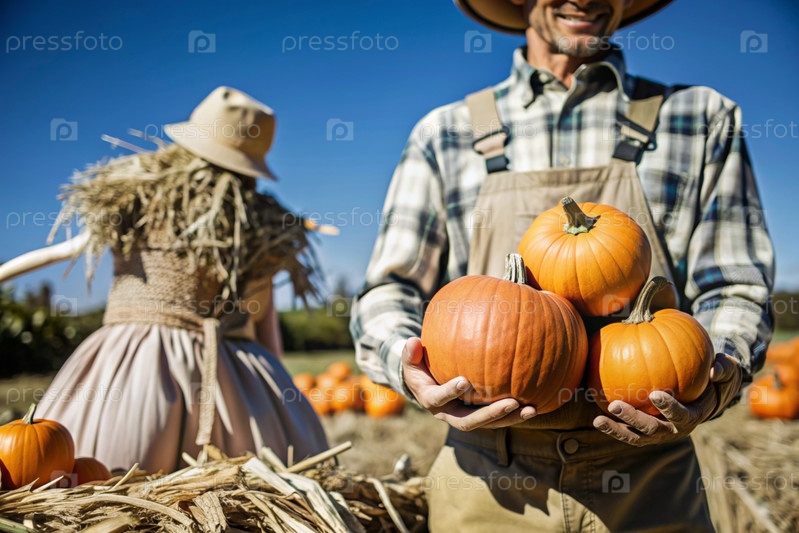 Руки мужчины в квадратной рубашке с тыквенным крупным планом и красивым осенним рисунком. Сбор тыков. Концепция празднования Дня благодарения и Хэллоуина