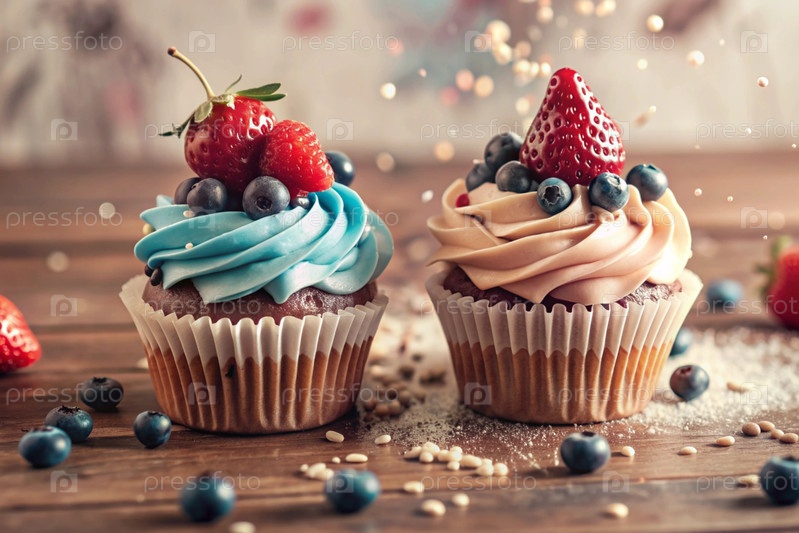 Вкусные красочные кексы со земляницами и чернилами. праздничный кекс, который идеально подходит для веселых торжеств. счастливого дня рождения