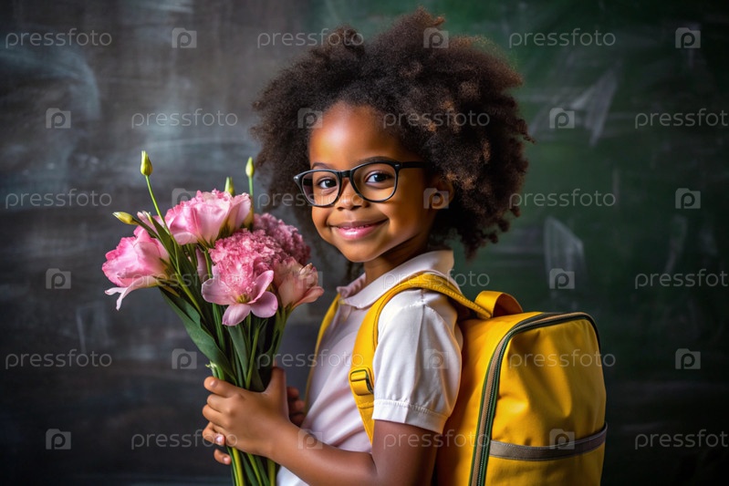 Чернокожая африканская девочка - первоклассница, которая носит очки. Букет цветов. Ребенок впервые ходит в школу. Ребёнок с рюкзаком, книгой и цветами. Возвращение к школе