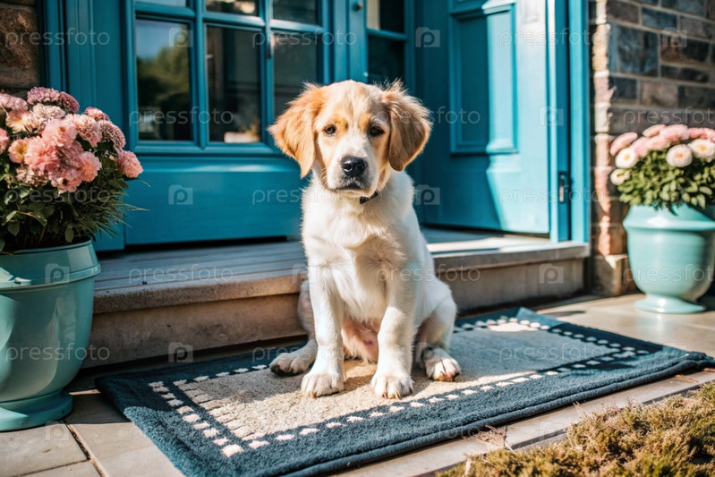 Щенок терпеливо сидит у входной двери, с нетерпением ждет своего хозяина и гуляет вместе с ним