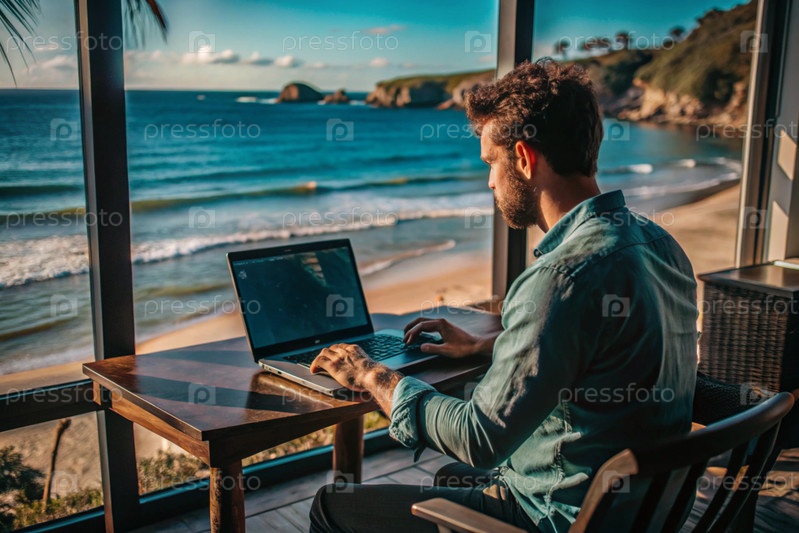 Молодой бизнесмен-фрилансер работает на ноутбуке, отдыхая у моря или делая покупки в Интернете
