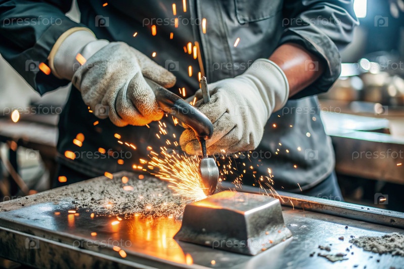 Работа на фабрике. Трудовые профессии. Мужские руки в металлических защитных перчатках. Вокруг искры. Тяжелая работа, требующая высокой концентрации и профессионализма