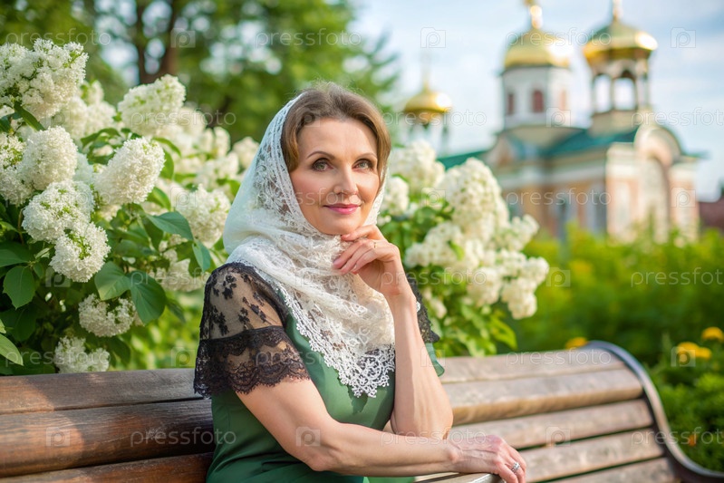 Красивая женщина в плато сидит на скамейке рядом с цветущим деревом перед православной церковью