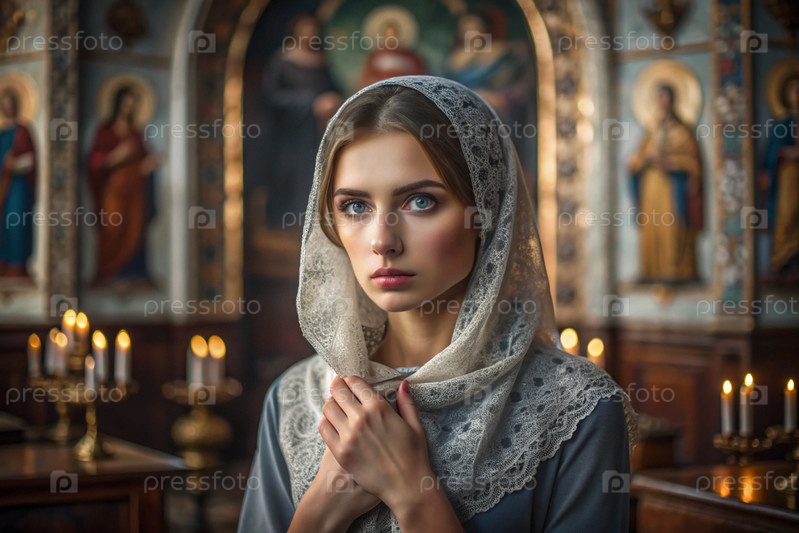 Портрет красивой молодой женщины с платками в православной церкви.Девушка молится в церкви среди икон