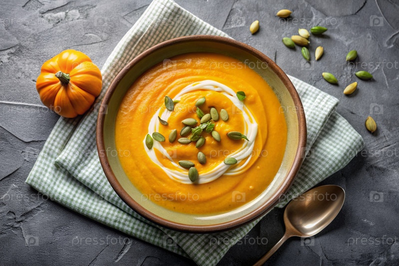 Традиционный мягкий тыквенный кремовый суп с сливками и семьями тыквы на сером бетонном фоне