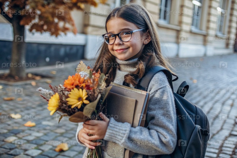 Красивая девушка с очками и букетом осенних цветов впервые идет в школу. Ребенок со школьной сумкой, книгой и цветами. Малыш на городской улице
