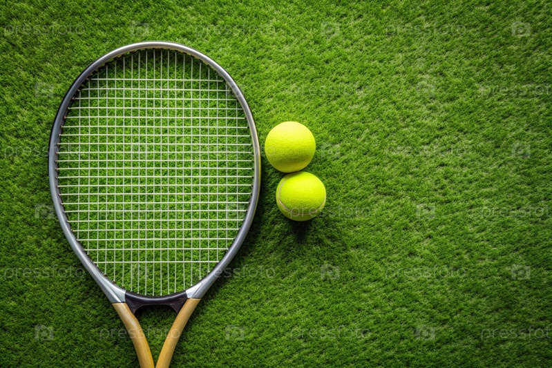 На лужайке жёлтый теннисный мяч и теннисная ракетка, летний вид спорта