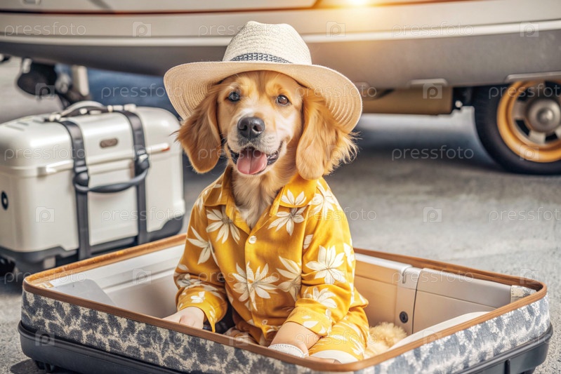 Стильный щенок в путешествии, очаровательная забавная собака в гавайской рубашке и шляпе, сидящая в открытом чемодане