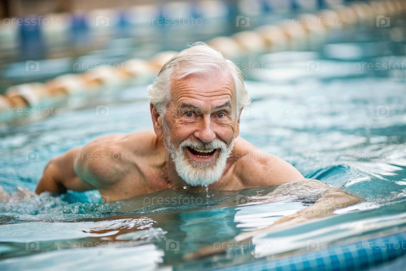Пожилой мужчина плавает и занимается водной аэробикой в отопительном бассейне, счастливый и улыбающийся пенсионер