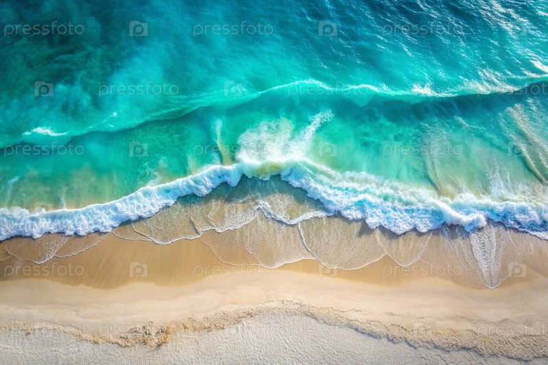 Концепция отдыха и путешествий. Красивый фон. Вид сверху на белый песчаный пляж и пенообразная волна бирюзового океана