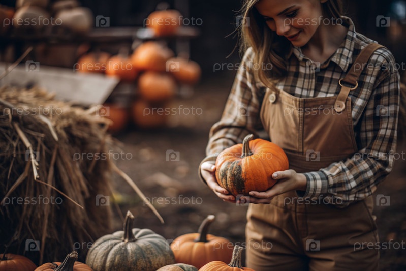 Руки женщины в квадратной рубашке с тыквенным крупным планом и красивым осенним рисунком. Сбор тыков. Концепция празднования Дня благодарения и Хэллоуина