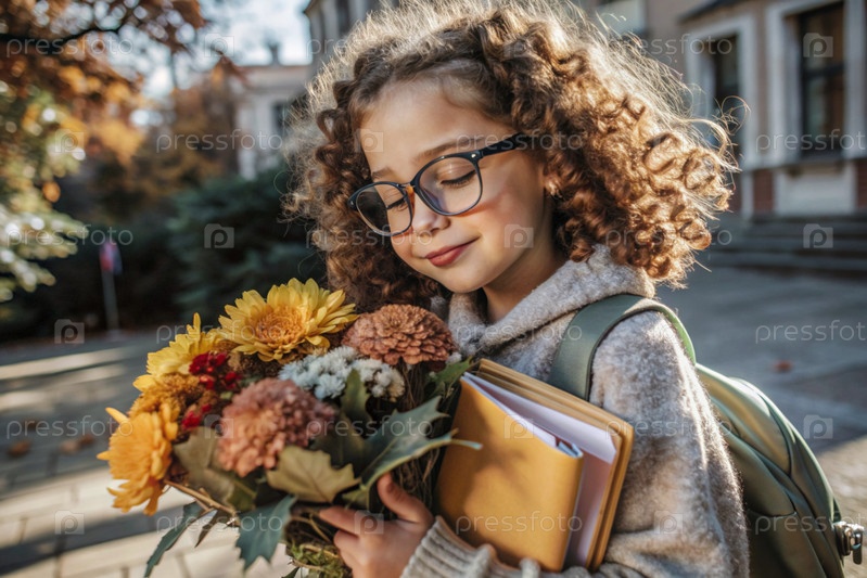 Красивая маленькая кудрявая девочка в очках и букете осенних цветов ходит в школу впервые. Ребенок со школьной сумкой, книгой и цветами. Малыш на городской улице. Возвращение к школе