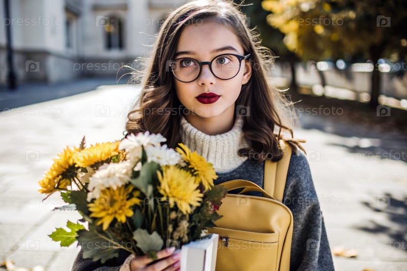 Красивая девушка с очками и букетом осенних цветов впервые идет в школу. Ребенок со школьной сумкой, книгой и цветами. Малыш на городской улице