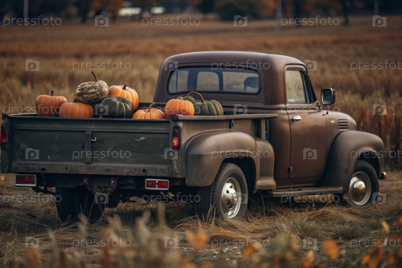 Осень, осенний дизайн.Большой урожай тыквы на заднем сиденье ретро-пикапа, крупный план