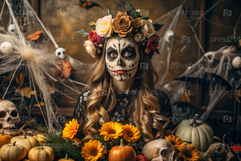 Концепция Хэллоуина. Ужасно. Костюмированная вечеринка. Красивая женщина с покрашенным черепом на лице и цветами на голове. Баннер, открытка