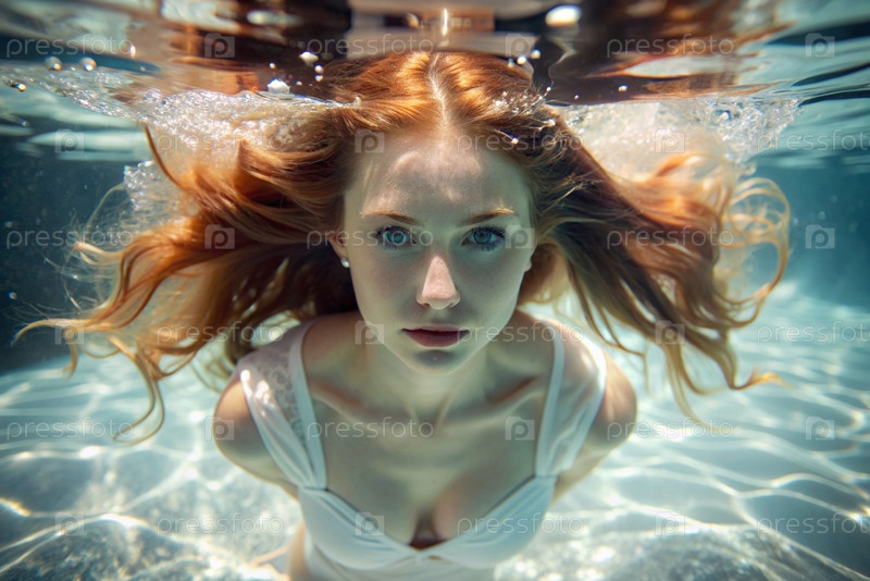 Портрет красивой рыжеволосой девушки в модном белом платье под водой на глубине