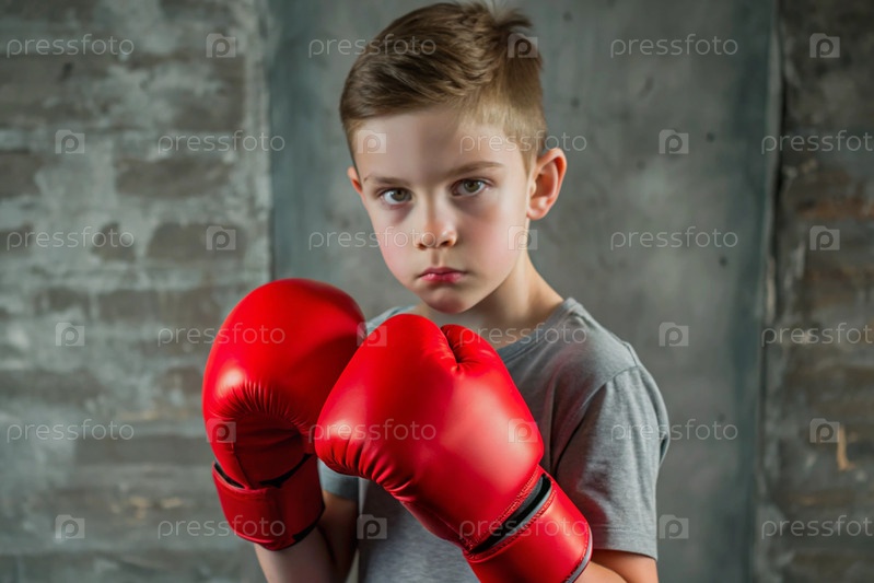 Мальчик в боксерских перчатках бьет, красивый подросток стоит в позе бойца, готового к бою