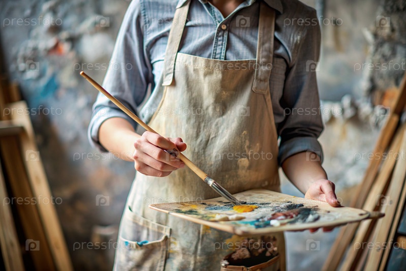 Близко. Понятие творческой деятельности. Художник в мастерской с маслом и кистью в руках. Искусство, креативность и отдых