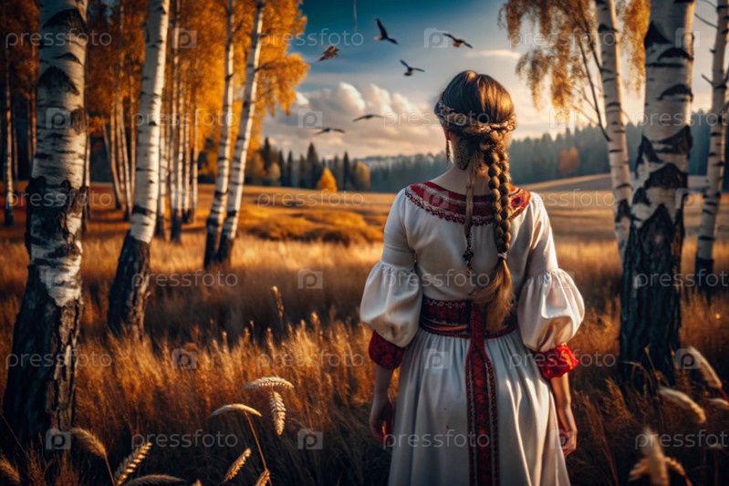 Девушка в традиционном русском льняном наряде и с сковородой на голове на поле спелой золотистой пшеницы на фоне березы и православной церкви