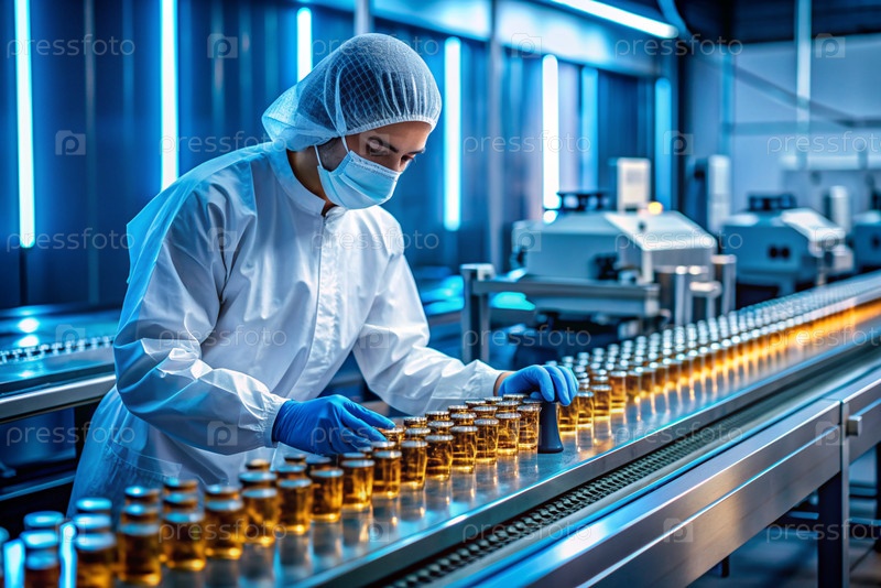 Производство лекарств: фармацевт тестирует медицинские флаконы на автоматическом трубопроводе фармацевтической производственной линии с использованием искусственного интеллекта