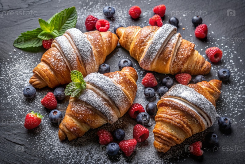 Вкусные свежевыпеченные кроассанты и ягоды на тёмном фоне сланца. французский завтрак. хорошие блинчики для выпечки. пекарня со вкусным хлебом. кондитерские изделия